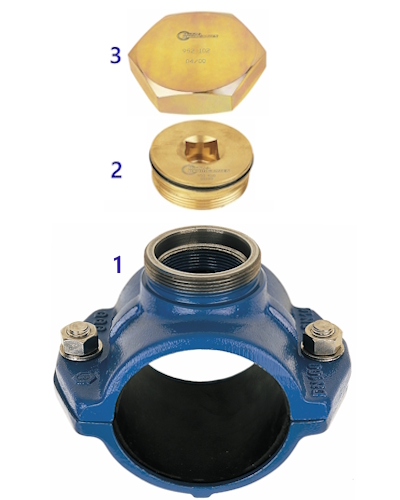 Anbohrbrücke für Anbohrungen Ø 50 mm , mit 2" I.-Gew. x 2½" A.-Gew., passend zu Stopfen 950 208