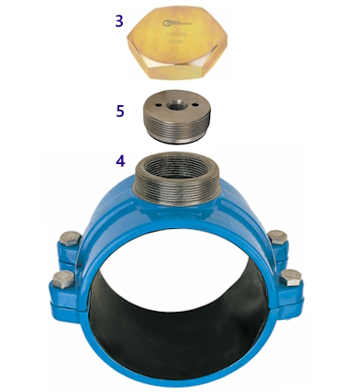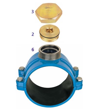 Blasensetzschelle, für Anbohrungen Ø56,5 mm mit G 2½“ A-Gew. und Rp 2“ I-Gew. (+ Ausdrehung für MS-Stopfen 2” mit O-Ring)